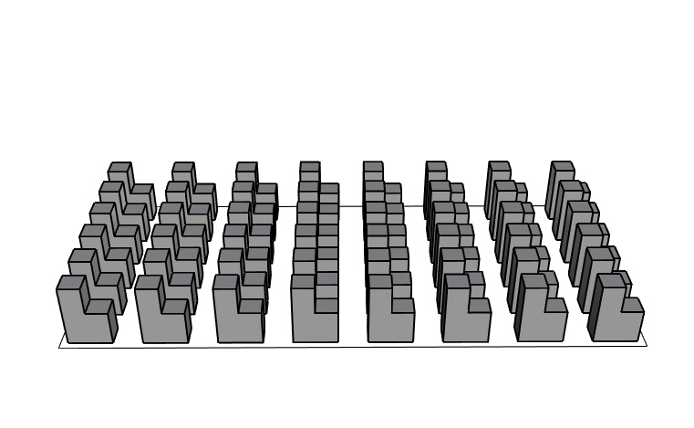 We present a very simple strategy that does not require an extra sensor for this calibration; A grid of blocks is printed which, starting from halfway, are printed with a gradually darker color. Effectively a darker color just means that those pixels are turned off for a longer period of time in each refresh period. Depending on the light intensity in the corresponding part of the build table the darker layers will start failing at different heights. If we precisely measure the height of each block we can accurately map the intensity and generate a corresponding correction map.