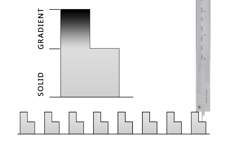 We assume that the layer exposure time has been chosen approximately based on previous prints or the material specifications. This does not have to be exact but should not be more than double the minimum exposure time; we use a gradient from full white (255) to half white (128). Also it should be long enough that all solid bases form properly. If all blocks are fully built the exposure time should be reduced by at least 50%.