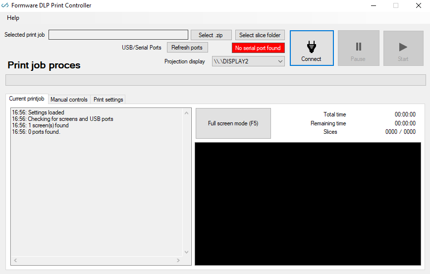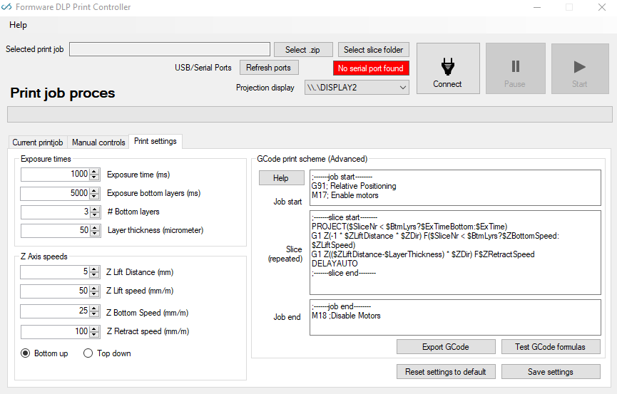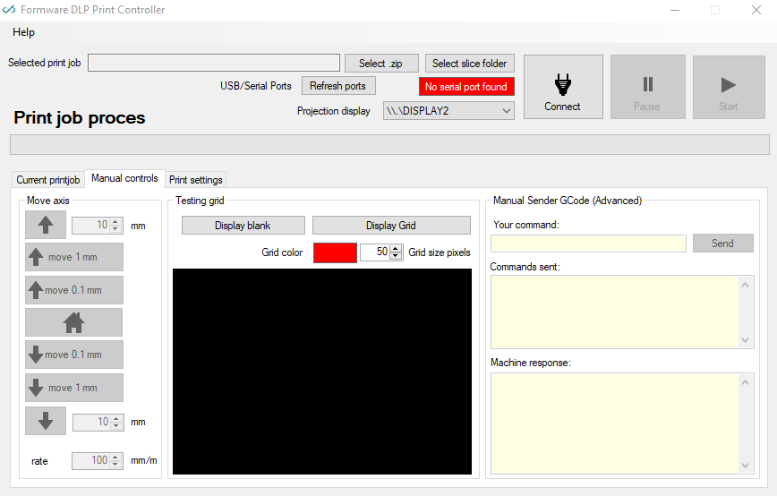 DLP Print controller is a freeware program to control your GCode based DLP 3D Printer directly from your windows PC. All you need to do is select a folder with slices and press the print button.